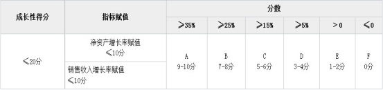 以上兩個指標分別對照下表評價檔次(ABCDEF)得出分值,兩項得分相加計算出企業(yè)成長性指標綜合得分。