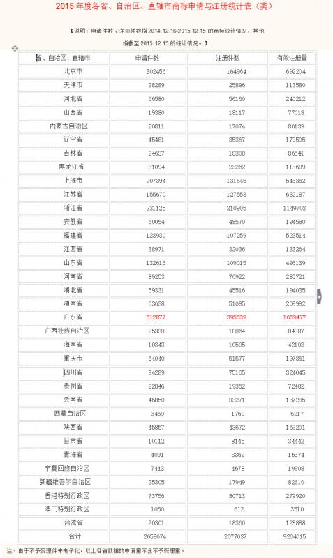 2015年度各省、自治區(qū)、直轄市商標(biāo)申請與注冊統(tǒng)計表(類)
