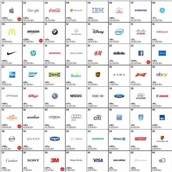 其他上榜的科技公司包括微軟,排名第四;IBM排名第5,三星第7,亞馬遜第10,英特爾第14,思科第15,甲骨文第16,惠普第18,F(xiàn)acebook第23,eBay第32,華為第88,Paypal第97,而聯(lián)想排名第100位。